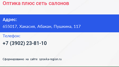 Оптика плюс, сеть салонов по адресу 655017, Хакасия, Абакан, Пушкина, 117 в дальнейшем Организация, размещена в следующих категориях:
