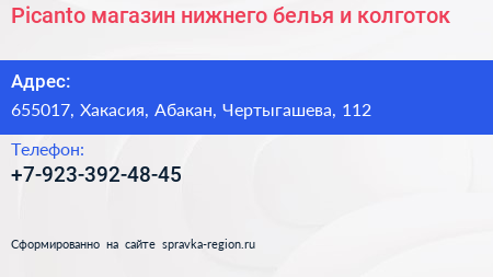 Picanto, магазин нижнего белья и колготок по адресу 655017, Хакасия, Абакан, Чертыгашева, 112 в дальнейшем Организация, размещена в следующих категориях: