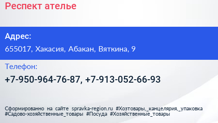 Респект, ателье по адресу 655017, Хакасия, Абакан, Вяткина, 9 в дальнейшем Организация, размещена в следующих категориях:
