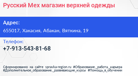 Русский Мех, магазин верхней одежды по адресу 655017, Хакасия, Абакан, Вяткина, 19 в дальнейшем Организация, размещена в следующих категориях: