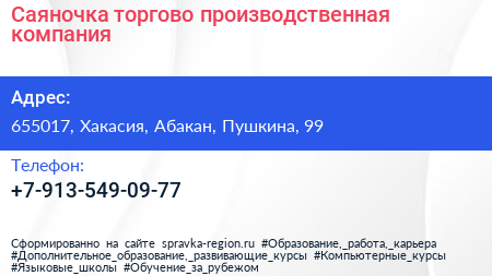 Саяночка, торгово-производственная компания по адресу 655017, Хакасия, Абакан, Пушкина, 99 в дальнейшем Организация, размещена в следующих категориях: