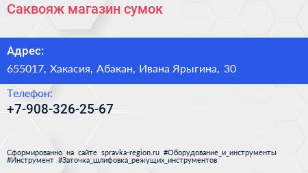 Саквояж, магазин сумок по адресу 655017, Хакасия, Абакан, Ивана Ярыгина, 30 в дальнейшем Организация, размещена в следующих категориях: