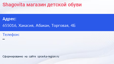 Shagovita, магазин детской обуви по адресу 655016, Хакасия, Абакан, Торговая, 4Б в дальнейшем Организация, размещена в следующих категориях: