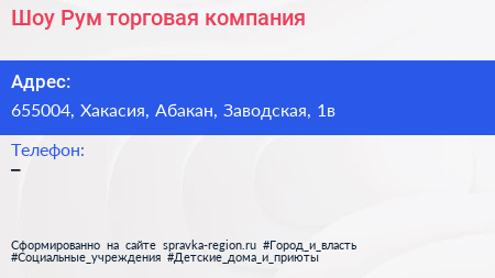 Шоу Рум, торговая компания по адресу 655004, Хакасия, Абакан, Заводская, 1в в дальнейшем Организация, размещена в следующих категориях: