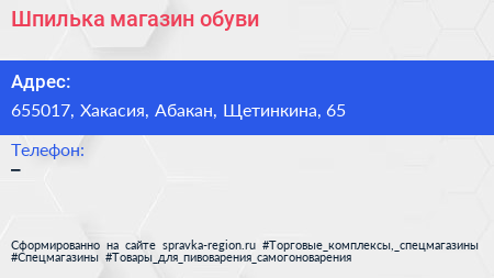 Шпилька, магазин обуви по адресу 655017, Хакасия, Абакан, Щетинкина, 65 в дальнейшем Организация, размещена в следующих категориях: