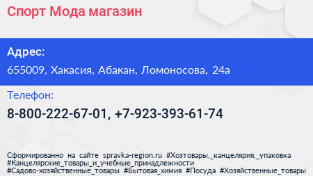 Спорт+Мода, магазин по адресу 655009, Хакасия, Абакан, Ломоносова, 24а в дальнейшем Организация, размещена в следующих категориях: