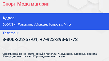 Спорт+Мода, магазин по адресу 655017, Хакасия, Абакан, Кирова, 99Б в дальнейшем Организация, размещена в следующих категориях: