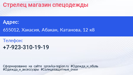 Стрелец, магазин спецодежды по адресу 655012, Хакасия, Абакан, Катанова, 12 к8 в дальнейшем Организация, размещена в следующих категориях: