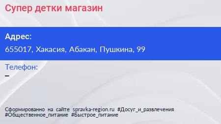 Супер детки, магазин по адресу 655017, Хакасия, Абакан, Пушкина, 99 в дальнейшем Организация, размещена в следующих категориях: