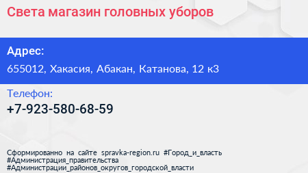 Света, магазин головных уборов по адресу 655012, Хакасия, Абакан, Катанова, 12 к3 в дальнейшем Организация, размещена в следующих категориях: