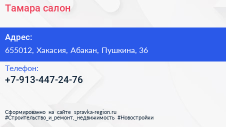 Тамара, салон по адресу 655012, Хакасия, Абакан, Пушкина, 36 в дальнейшем Организация, размещена в следующих категориях: