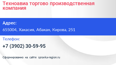 Техноавиа, торгово-производственная компания по адресу 655004, Хакасия, Абакан, Кирова, 251 в дальнейшем Организация, размещена в следующих категориях: