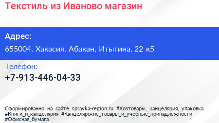 Текстиль из Иваново, магазин по адресу 655004, Хакасия, Абакан, Итыгина, 22 к5 в дальнейшем Организация, размещена в следующих категориях: