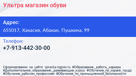 Ультра, магазин обуви по адресу 655017, Хакасия, Абакан, Пушкина, 99 в дальнейшем Организация, размещена в следующих категориях: