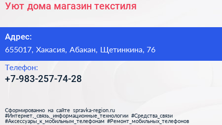 Уют дома, магазин текстиля по адресу 655017, Хакасия, Абакан, Щетинкина, 76 в дальнейшем Организация, размещена в следующих категориях: