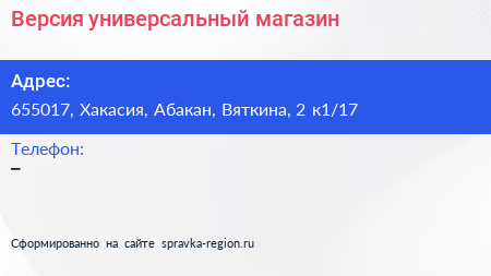Версия, универсальный магазин по адресу 655017, Хакасия, Абакан, Вяткина, 2 к1/17 в дальнейшем Организация, размещена в следующих категориях:
