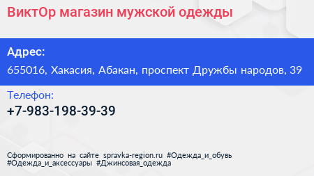 ВиктОр, магазин мужской одежды по адресу 655016, Хакасия, Абакан, проспект Дружбы народов, 39 в дальнейшем Организация, размещена в следующих категориях: