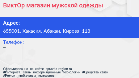 ВиктОр, магазин мужской одежды по адресу 655001, Хакасия, Абакан, Кирова, 118 в дальнейшем Организация, размещена в следующих категориях: