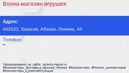 Волна, магазин игрушек по адресу 662621, Хакасия, Абакан, Ленина, 44 в дальнейшем Организация, размещена в следующих категориях: