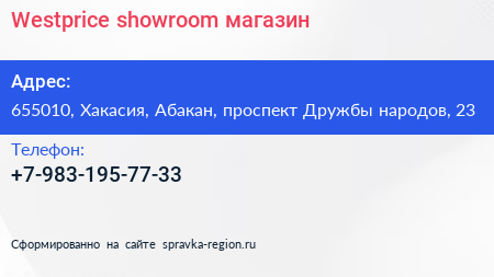 Westprice showroom, магазин по адресу 655010, Хакасия, Абакан, проспект Дружбы народов, 23 в дальнейшем Организация, размещена в следующих категориях: