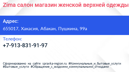 Zima, салон-магазин женской верхней одежды по адресу 655017, Хакасия, Абакан, Пушкина, 99а в дальнейшем Организация, размещена в следующих категориях: