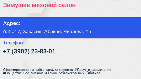 Зимушка, меховой салон по адресу 655017, Хакасия, Абакан, Чкалова, 15 в дальнейшем Организация, размещена в следующих категориях: