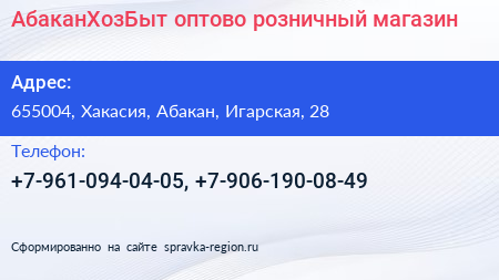 АбаканХозБыт, оптово-розничный магазин по адресу 655004, Хакасия, Абакан, Игарская, 28 в дальнейшем Организация, размещена в следующих категориях: