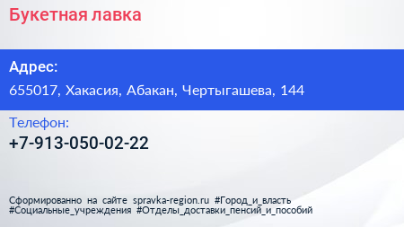 Букетная лавка по адресу 655017, Хакасия, Абакан, Чертыгашева, 144 в дальнейшем Организация, размещена в следующих категориях: