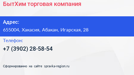 БытХим, торговая компания по адресу 655004, Хакасия, Абакан, Игарская, 28 в дальнейшем Организация, размещена в следующих категориях: