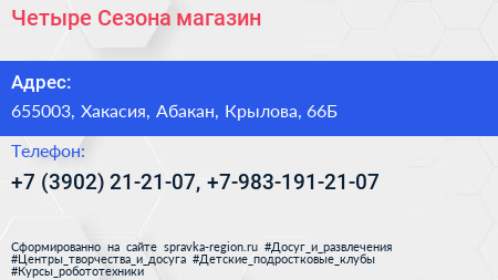 Четыре Сезона, магазин по адресу 655003, Хакасия, Абакан, Крылова, 66Б в дальнейшем Организация, размещена в следующих категориях: