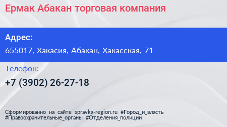 Ермак-Абакан, торговая компания по адресу 655017, Хакасия, Абакан, Хакасская, 71 в дальнейшем Организация, размещена в следующих категориях: