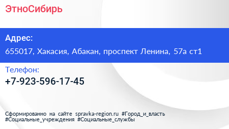 ЭтноСибирь по адресу 655017, Хакасия, Абакан, проспект Ленина, 57а ст1 в дальнейшем Организация, размещена в следующих категориях: