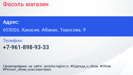 Фасоль, магазин по адресу 655016, Хакасия, Абакан, Торосова, 9 в дальнейшем Организация, размещена в следующих категориях: