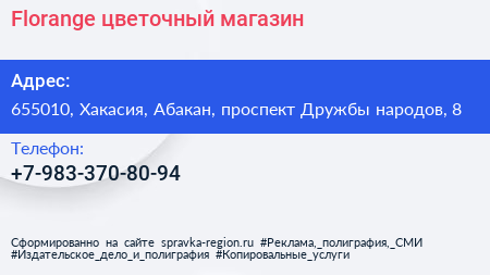 Florange, цветочный магазин по адресу 655010, Хакасия, Абакан, проспект Дружбы народов, 8 в дальнейшем Организация, размещена в следующих категориях: