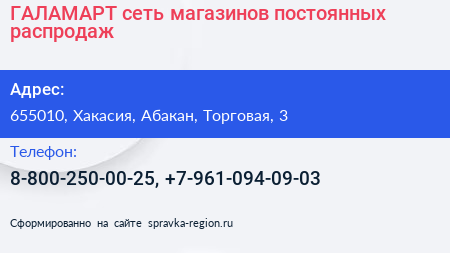 ГАЛАМАРТ, сеть магазинов постоянных распродаж по адресу 655010, Хакасия, Абакан, Торговая, 3 в дальнейшем Организация, размещена в следующих категориях: