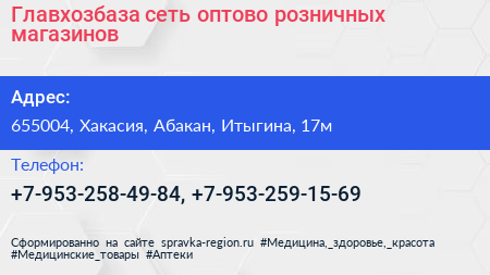 Главхозбаза, сеть оптово-розничных магазинов по адресу 655004, Хакасия, Абакан, Итыгина, 17м в дальнейшем Организация, размещена в следующих категориях: