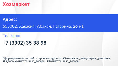 Хозмаркет по адресу 655002, Хакасия, Абакан, Гагарина, 26 к1 в дальнейшем Организация, размещена в следующих категориях: