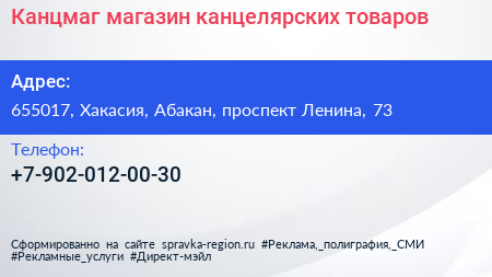 Канцмаг, магазин канцелярских товаров по адресу 655017, Хакасия, Абакан, проспект Ленина, 73 в дальнейшем Организация, размещена в следующих категориях:
