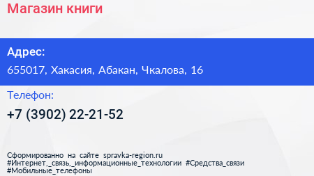 Магазин книги по адресу 655017, Хакасия, Абакан, Чкалова, 16 в дальнейшем Организация, размещена в следующих категориях: