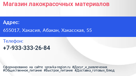 Магазин лакокрасочных материалов по адресу 655017, Хакасия, Абакан, Хакасская, 55 в дальнейшем Организация, размещена в следующих категориях: