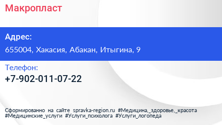 Макропласт по адресу 655004, Хакасия, Абакан, Итыгина, 9 в дальнейшем Организация, размещена в следующих категориях: