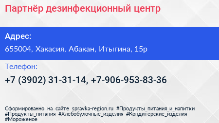 Партнёр, дезинфекционный центр по адресу 655004, Хакасия, Абакан, Итыгина, 15р в дальнейшем Организация, размещена в следующих категориях: