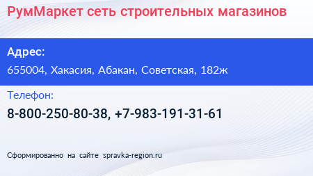 РумМаркет, сеть строительных магазинов по адресу 655004, Хакасия, Абакан, Советская, 182ж в дальнейшем Организация, размещена в следующих категориях: