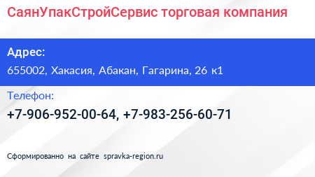 СаянУпакСтройСервис, торговая компания по адресу 655002, Хакасия, Абакан, Гагарина, 26 к1 в дальнейшем Организация, размещена в следующих категориях:
