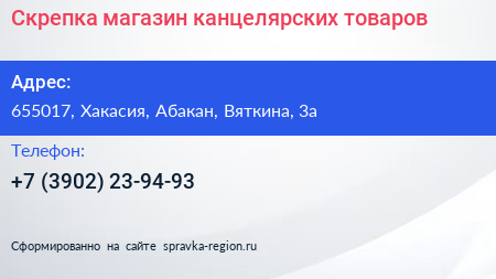 Скрепка, магазин канцелярских товаров по адресу 655017, Хакасия, Абакан, Вяткина, 3а в дальнейшем Организация, размещена в следующих категориях: