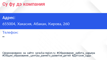 Су-фу-дэ, компания по адресу 655004, Хакасия, Абакан, Кирова, 260 в дальнейшем Организация, размещена в следующих категориях: