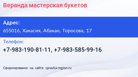 Веранда, мастерская букетов по адресу 655016, Хакасия, Абакан, Торосова, 17 в дальнейшем Организация, размещена в следующих категориях: