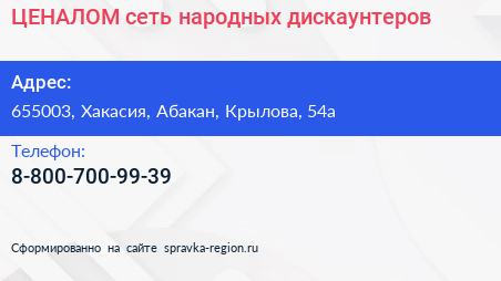 ЦЕНАЛОМ, сеть народных дискаунтеров по адресу 655003, Хакасия, Абакан, Крылова, 54а в дальнейшем Организация, размещена в следующих категориях: