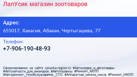 ЛапУсик, магазин зоотоваров по адресу 655017, Хакасия, Абакан, Чертыгашева, 77 в дальнейшем Организация, размещена в следующих категориях: