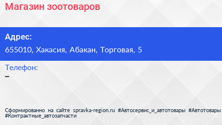 Магазин зоотоваров по адресу 655010, Хакасия, Абакан, Торговая, 5 в дальнейшем Организация, размещена в следующих категориях: